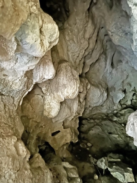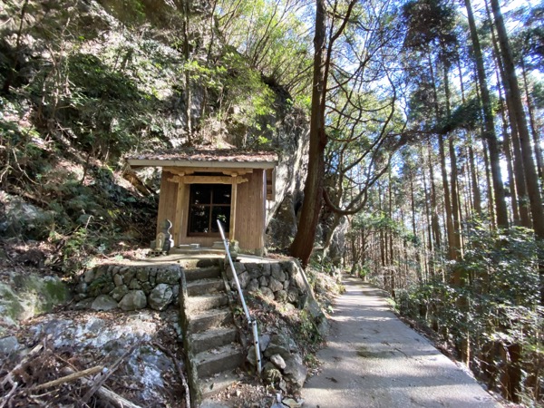 崩落気味の川沿いの細道(化石が出土する)を辿っていくと峡谷の奥に本匠最古1154年の宇土権現の社祠がある。谷の奥に進むと洞穴の中に乳神様として祀られてきた宇土権現の由来となった乳房に似た岩がある。