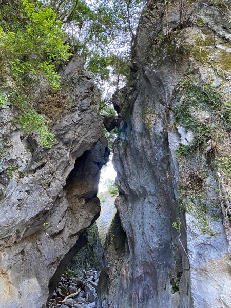 南画の大家田能村竹田が「斧が裂く如し、白石磷磷たり」と激賞した渓谷。以前のような幽玄の世界は減じたが、今も尚、白玉のごとき岩と転石が目を楽しませてくれる。入口上部にはハート型の岩石が挟まっている。